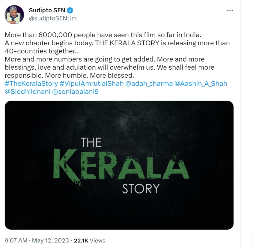 सुदीप्तो सेन ने द केरल स्टोरी के बारे में बताते हुए ट्वीट किया, "भारत में अब तक इस फिल्म को 6000,000 से ज्यादा लोग देख चुके हैं। आज से एक नया अध्याय शुरू हो रहा है। द केरल स्टोरी एक साथ 40 से ज्यादा देशों में रिलीज हो रही है...ज्यादा से ज्यादा नंबर जुड़ते जा रहे है। ढेर सारा आशीर्वाद, प्रेम और प्रशंसा हमें अभिभूत करेगा। इसके साथ ही हम और ज्यादा जिम्मेदार, ज्यादा विनम्र, ज्यादा प्यार महसूस करेंगे।"