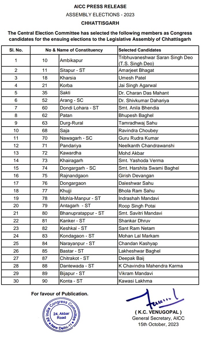 कांग्रेस के जारी लिस्ट में छत्तीसगढ़ के पाटन से भूपेश बघेल और अंबिकापुर से टीएस सिंह देव लड़ेंगे चुनाव। वहीं, साजा से रविंद्र चौबे, सीतापुर से अमरजीत भगत, खरसिया से उमेश पटेल, कोरबा से जय सिंह अग्रवाल, सक्ती से डा चरण दास महंत, आरंग से शिवकुमार डहरिया, डौंडी लोहारा से अनिला भेडि़या, नवागढ़ से गुरु रूद्र कुमार, पंडरिया से नीलकांत चंद्रवंशी, कवर्धा से मोहम्मद अकबर, कोंटा से कवासी लखमा, चित्रकोट से दीपक बैज, बीजापुर से विक्रम मंडावी, बस्तर से लखेश्वर बघेल को चुनाव मैदान में उतारा है।