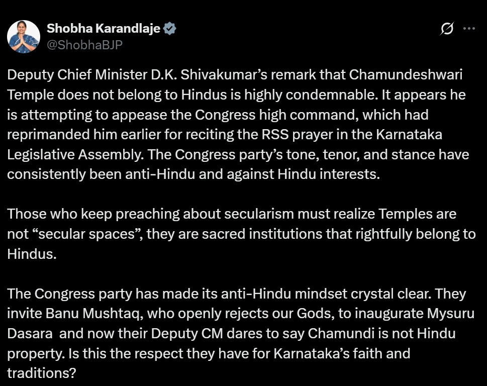 शोभा करंदलाजे ने एक्स पर लिखा, "डी.के. शिवकुमार का यह कहना कि चामुंडेश्वरी मंदिर हिंदुओं का नहीं है, बेहद निंदनीय है।" उन्होंने कांग्रेस पर हिंदू-विरोधी होने का आरोप लगाया और कहा कि मंदिर कोई "सेक्युलर जगह" नहीं, बल्कि हिंदुओं की पवित्र संस्था है।