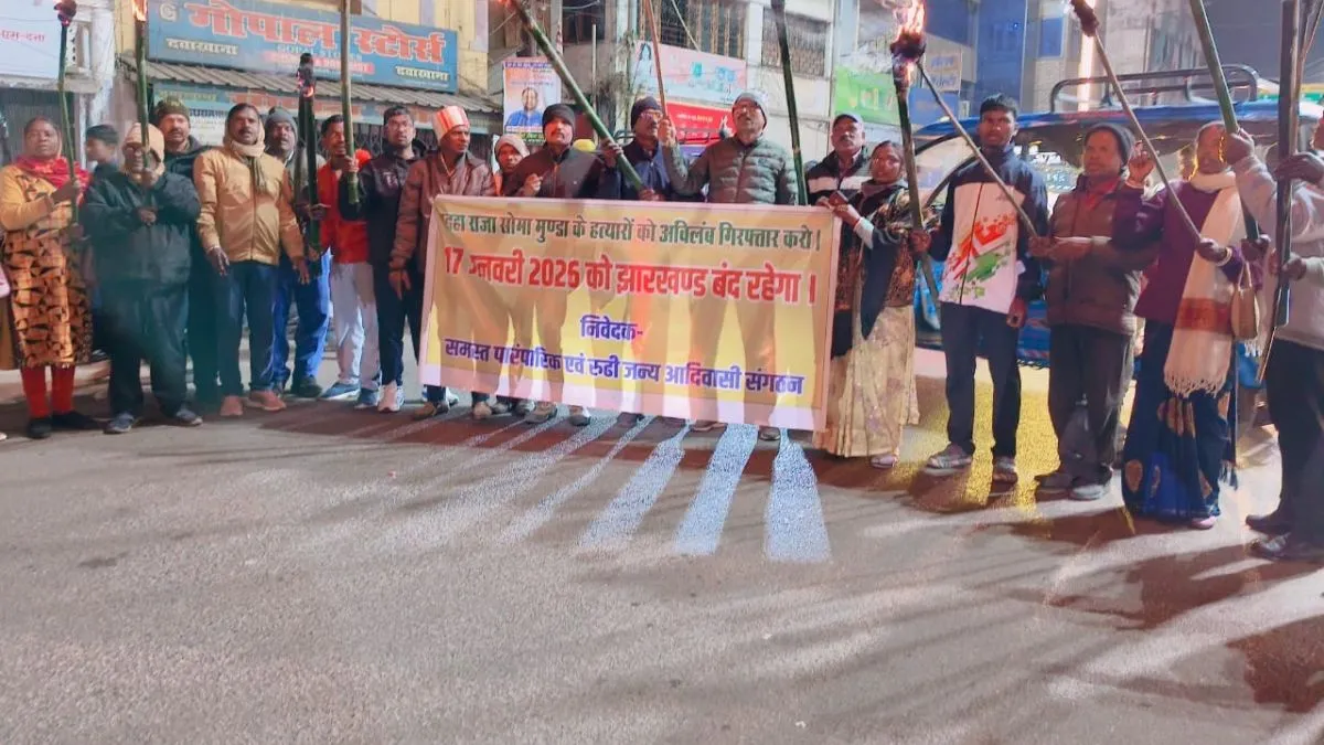 आदिवासी संगठनों ने पड़हा राजा सोमा मुंडा की हत्या में शामिल अपराधियों की शीघ्र गिरफ्तारी, पीड़ित परिवार को न्याय और आदिवासी पारंपरिक व्यवस्था की रक्षा करने की मांग को लेकर शनिवार को झारखंड बंद का आह्वान किया है। इसी उद्देश्य से मशाल जुलूस निकाल कर एकजुटता प्रदर्शित किया है।
