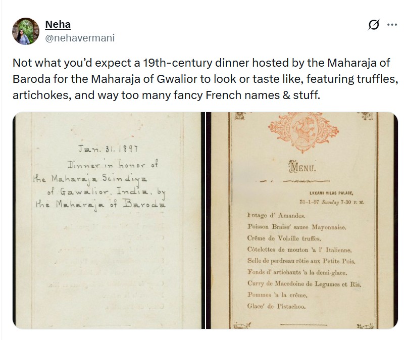 वर्मानी ने इसे कैप्शन दिया, 'ग्वालियर के महाराजा के लिए बड़ौदा के महाराजा द्वारा होस्ट किए गए 19वीं सदी का डिनर, जैसा आप उम्मीद नहीं करेंगे, जिसमें ट्रफल्स, आर्टिचोक और बहुत सारे फैंसी फ्रेंच नाम और सामान होंगे।' वे बिल्कुल सही हैं। इस मेन्यू से पता चलता है कि उस शाम मेहमानों को क्या-क्या परोसा गया।