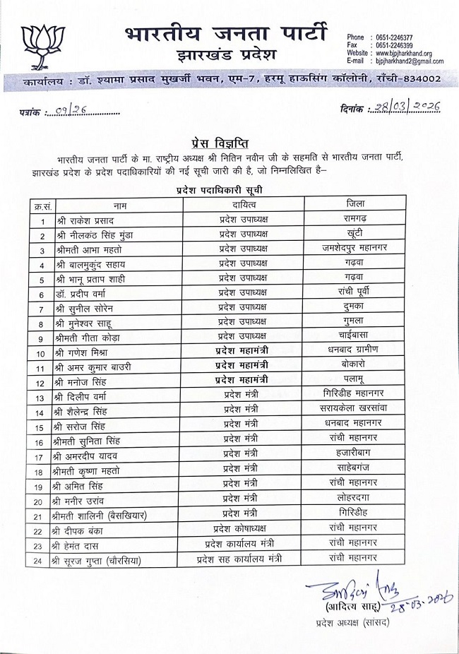 आदित्य साहू ने झारखंड भाजपा की 24 सदस्यीय टीम घोषित की।