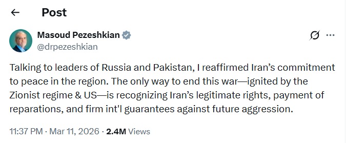 उन्होंने लिखा, "रूस और पाकिस्तान के नेताओं से बात करके, मैंने इस इलाके में शांति के लिए ईरान के वादे को फिर से पक्का किया। यहूदी शासन और US की ओर शुरू की गई इस लड़ाई को खत्म करने का इकलौता तरीका ईरान के कानूनी अधिकारों को मान्यता देना, हर्जाना देना और भविष्य में हमले के खिलाफ पक्की इंटरनेशनल गारंटी देना है।"