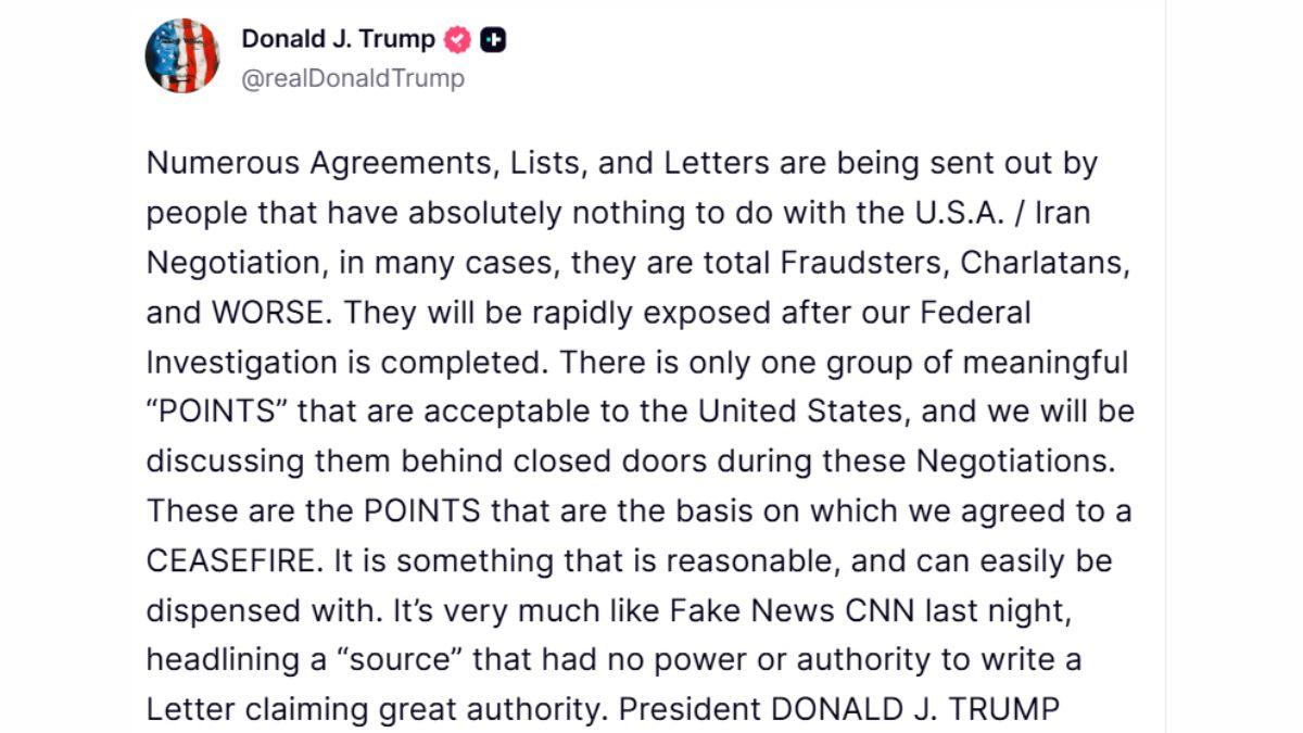 ट्रंप ने ट्रुथ सोशल पर पोस्ट में लिखा, 'बहुत से लोग ऐसे समझौते, सूचियां और चिट्ठियां भेज रहे हैं जिनका U.S.A. / ईरान की बातचीत से कोई लेना-देना नहीं है। कई मामलों में, वे पूरी तरह से धोखेबाज, ठग और उससे भी बदतर लोग हैं। हमारी संघीय जांच पूरी होने के बाद उनकी पोल जल्द ही खुल जाएगी।'