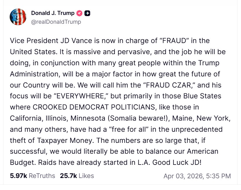 ट्रंप ने लिखा, 'हम उन्हें FRAUD CZAR कहेंगे, उनका ध्यान हर जगह' होगा, लेकिन मुख्य रूप से उन 'Blue States' में, जहां मेन, न्यूयॉर्क और कई अन्य जगहों के बेईमान डेमोक्रेट राजनेताओं ने टैक्स देने वालों के पैसे की चोरी में पूरी तरह से मनमानी की है। ये आंकड़ें इतने बड़े हैं कि, अगर हम सफल हुए, तो हम सचमुच अपने अमेरिकी बजट को संतुलित कर पाएंगे। लॉस अन्जेलीस में छापे पड़ने शुरू हो चुके हैं।'